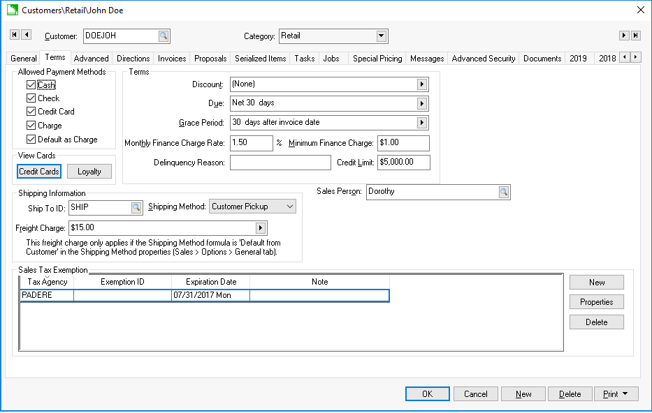 Open a customer account by selecting Sales > Customers from the main EBMS menu and opening a customer record.