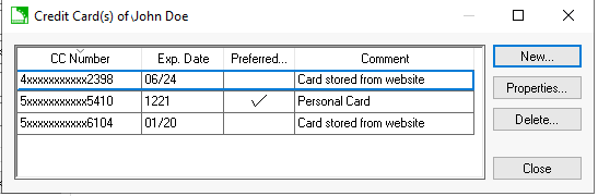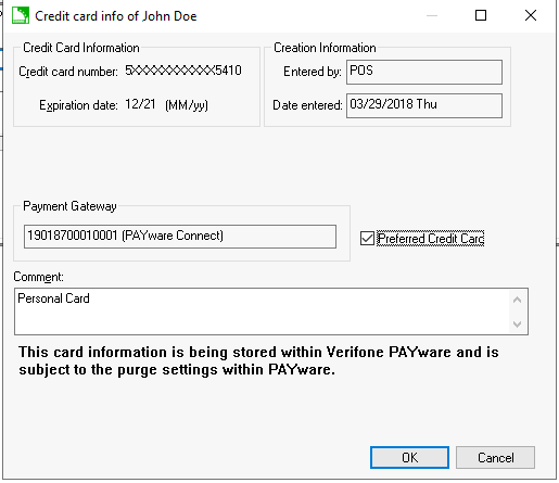 Note that only a few digits of the credit card number are available along with the expiration date. This dialog can be used to identify when and how the card was collected.