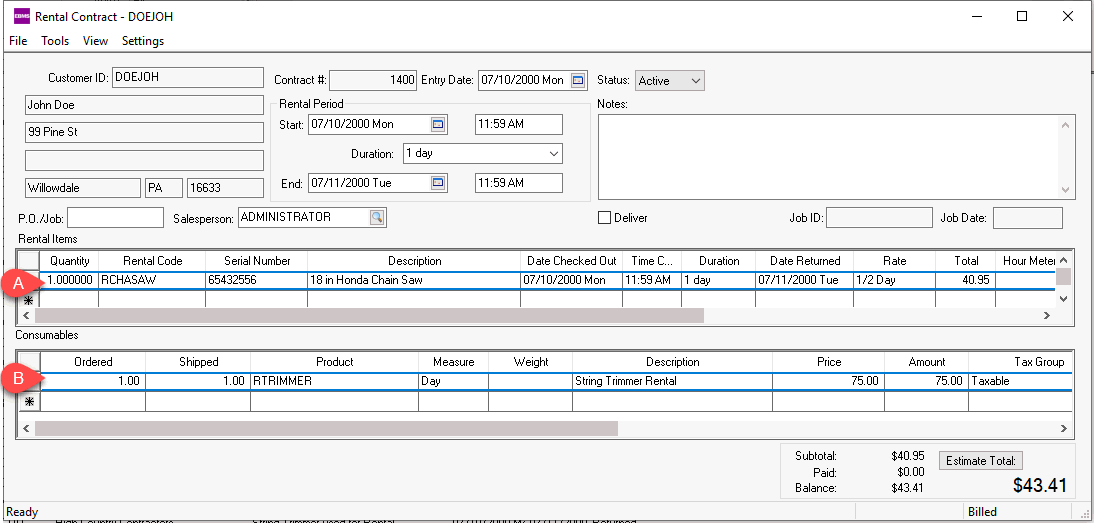 If the Rental Code is set the scan is identified as a rental item. If the Rental Code is blank the item is identified as a product to sell (consumed item)and the serial number is assigned like any other document (e.g. Sales Order) which consumes inventory.