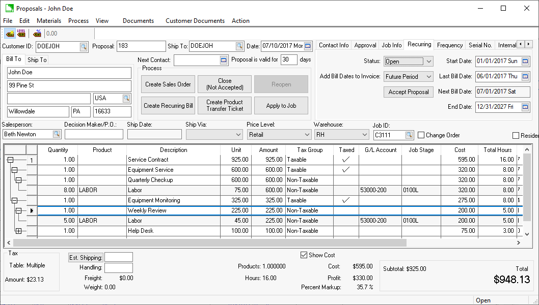 The Recurring Billing proposal can be integrated with a job within the Job Costing module to manage service contracts or other projects that require the user to manage expenses and bill the customer using recurring billing invoices. The Status of the job may change the Status within the attached proposal. Review the Service Contract section of the Job Costing Overview section within the Job Costing documentation for details of using the Recurring Billing and the Job Costing module.