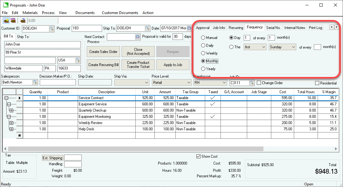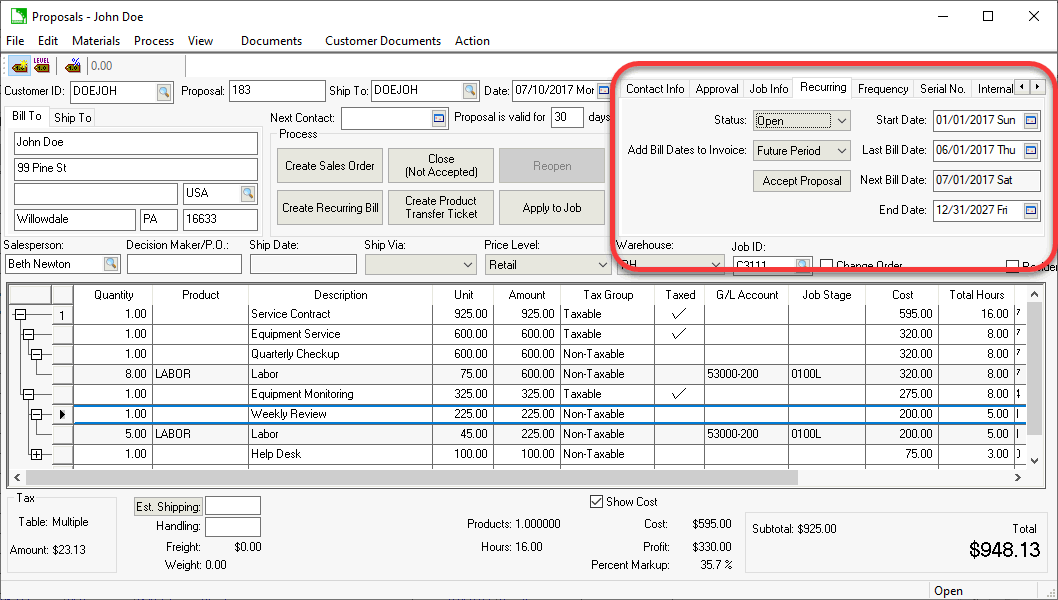 Review the Recurring Billing Process section for details on creating the recurring billing invoices from the proposal created within this section.