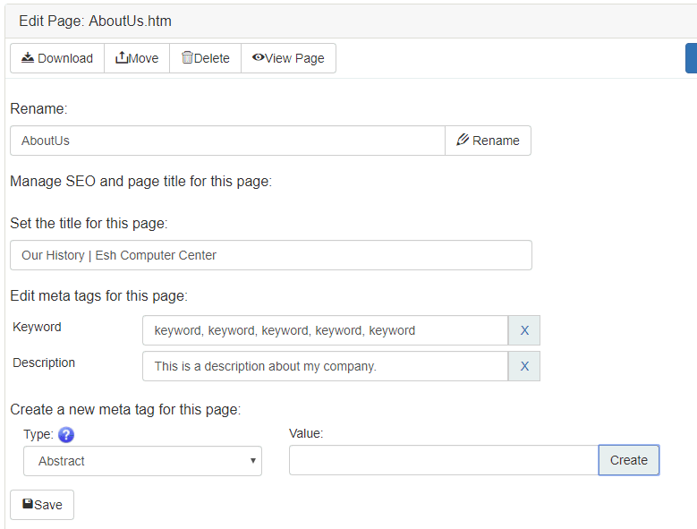 The File Name, Title, and Meta Tags are created or edited in this section of the website administrator.
