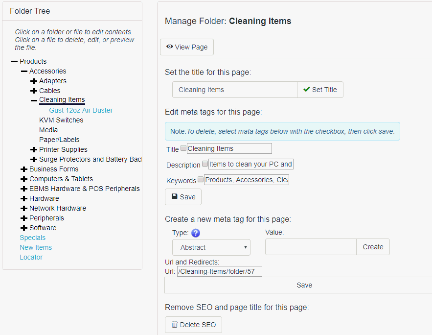 All Search Engine Optimization (SEO) can be done within the website administrator. The SEO for the e-commerce folders and items can be set up in the website administrator as well. Note that the SEO for e-commerce folders and items are originally defaulted but can be changed as needed.