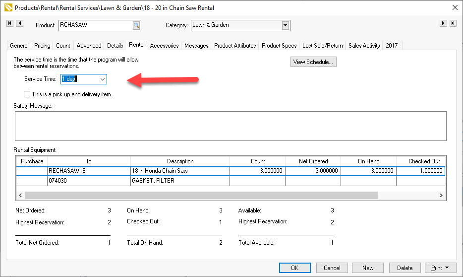 A rental code contains an option to set the average service time after a rental. This option will add this time to the rental return date and time before the equipment is available for re-rental. This setting may vary based on the equipment. Complete the following steps to set this fixed Service Time.