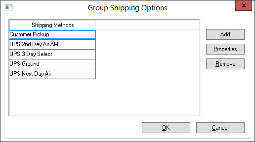Use the Add and Remove button to change the Shipping Methods list. Note that removing a shipping method from the list only disables it from the e-commerce site and does not disable or remove the shipping method from EBMS point-of-sale screens.