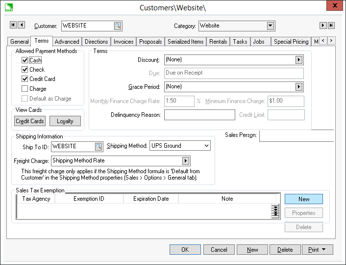 Open the customer record and click on the Terms tab. Open the generic customer to set the default shipping method for customers that do not log into the e-commerce site