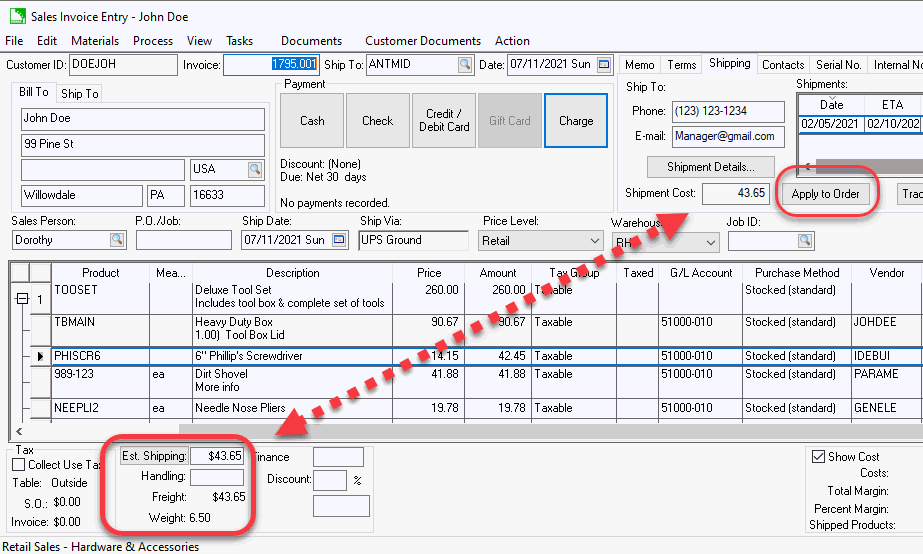 The Shipping and Handling entries can also be manually changed by the user to effect the total Freight costs.