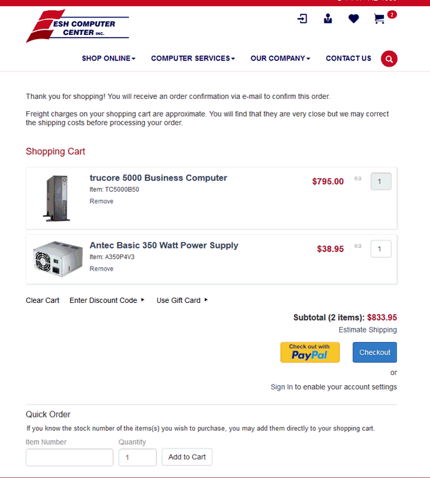 Items can also be added directly from the shopping cart by entering the inventory Item Number in the Quick Order. Click on the Add to Cart button to add the entered part number into the shopping cart