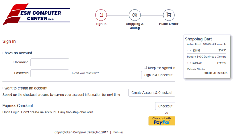 The Shopping Cart check out includes three options for the web customer. Note: The sign in step will be skipped if a customer has already signed into their customer account on the website.