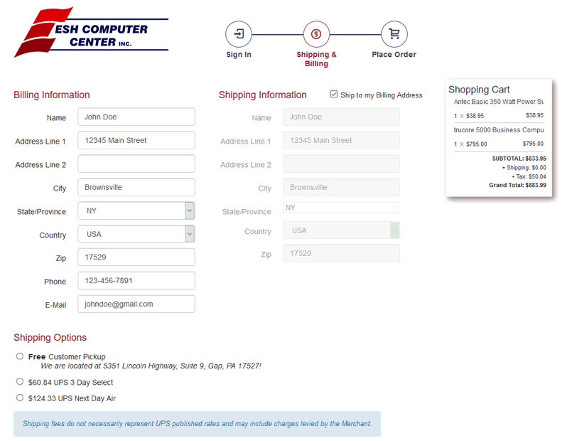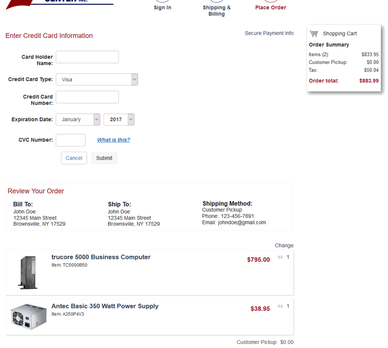 The customer must enter the billing information and shipping information. This information will default from the customer record if the customer logged into the site. Review the Customer Accounts section for more details. Defaults will be used from the generic customer assigned if the customer has not logged in. Review the Creating a Generic Customer section for more details.