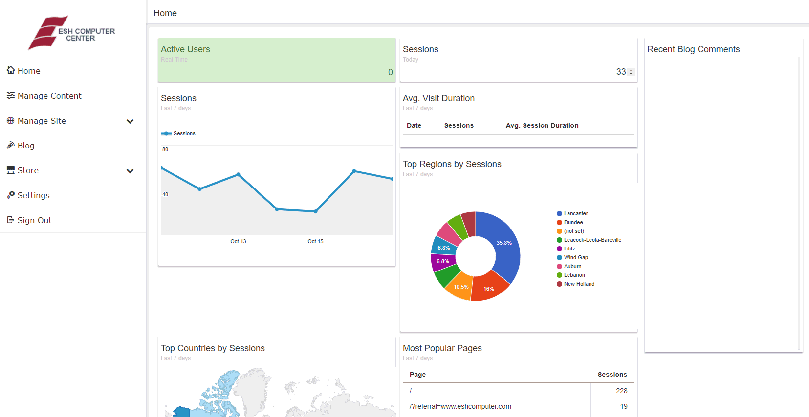 The main screen of the admin displays statistics for the website's Google Analytics. Google Analytics must be set up on the website for this to work.