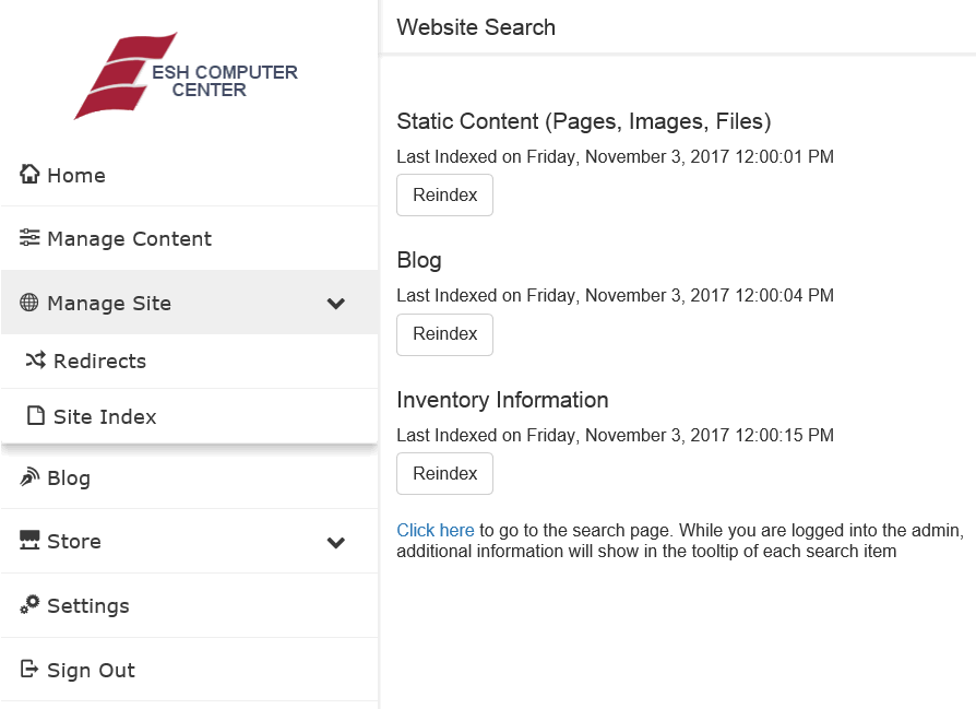 3. Click the Reindex button to index Static Content, Blog, or Inventory Information.