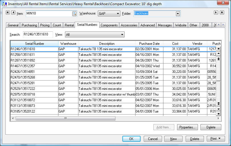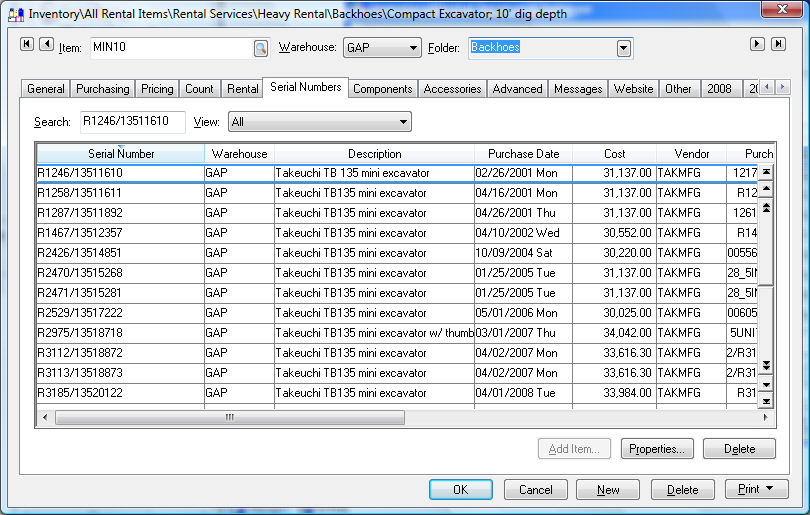 Available for rent or sale - The status indicates that the rental equipment is in stock. The equipment status will be in this state as soon as the purchase invoice is processed or the item is properly added. Continue with this section for more details on viewing and adding the individual pieces of equipment for rent or sale.