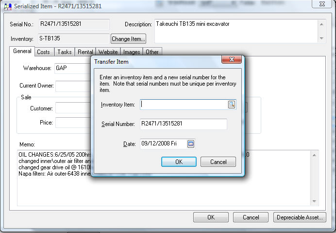 Select the rental equipment Inventory Item from the transfer item dialog. Review the Getting Started > Entering Rental Equipment section for more details on rental equipment codes. Enter the Date for the inventory transfer general ledger transactions and click OK.