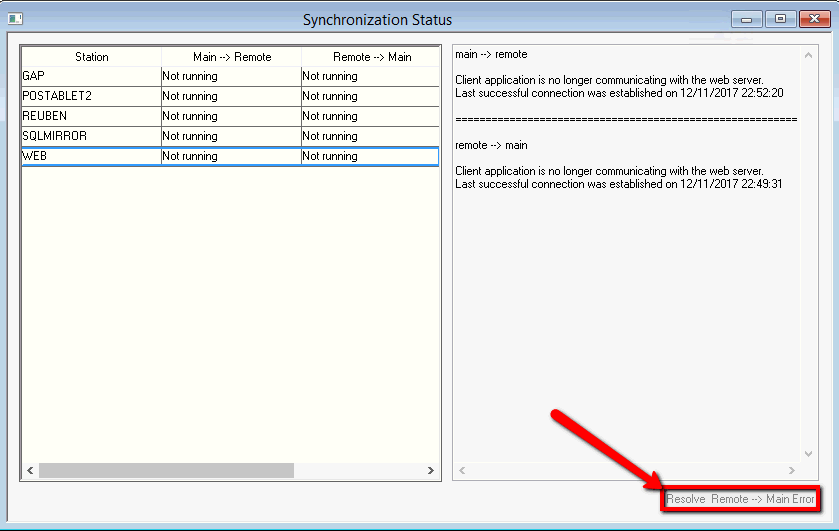 Within EBMS select File > Synchronization Status. Select a device and click Resolve Error button.