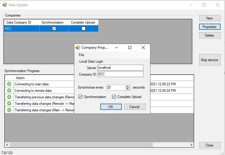 To view the status of the Data Synchronization Service, launch the Web Update Administration from C:\Program Files(x86)\EBMS\WebUpdateAdministrator.exe. The Synchronization progresses through each action, pushing and pulling changes to the server.