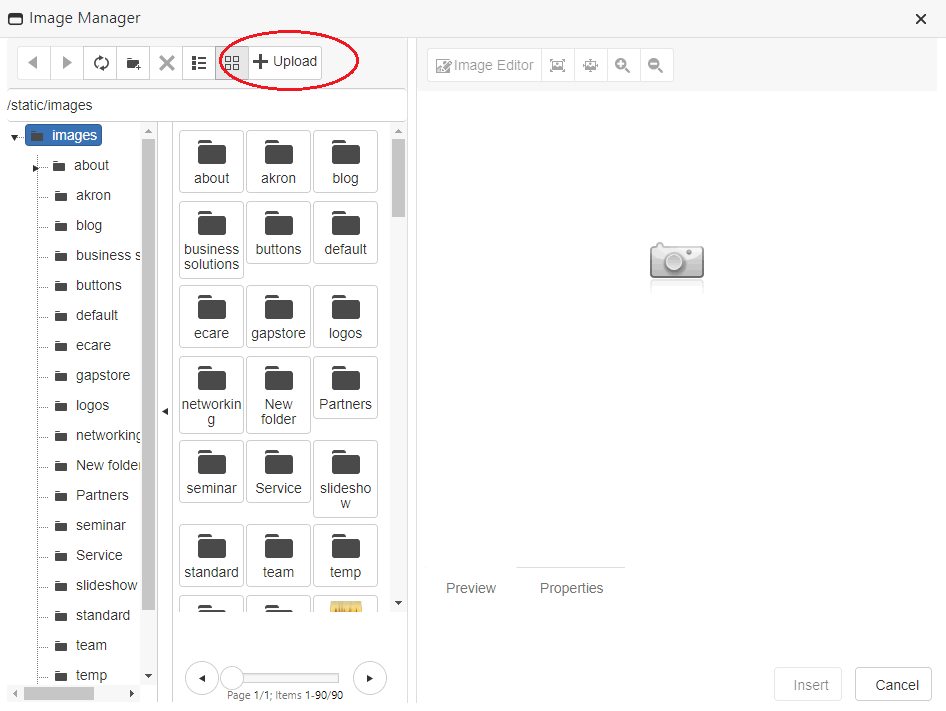 The RAD editor contains easy-to-use managers that allow the user to upload and add images, files, and media to a website page.