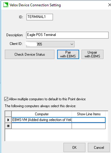 Enable Allow multiple computers to default to this device if multiple EBMS POS clients are using the same payment terminal hardware.