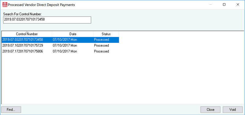 Direct payments for are processed in batches from the Vendor Payment dialog. These batches can be viewed or voided by selecting option from the main EBMS menu. The following dialog will open:
