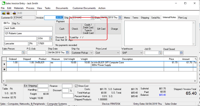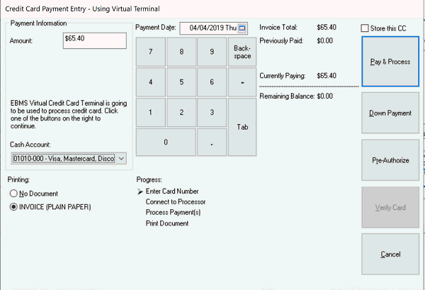 The EBMS virtual terminal can be used within the EBMS software where payments are processed. Review the following steps to process credit card payments using the virtual terminal in the sales invoice dialog.