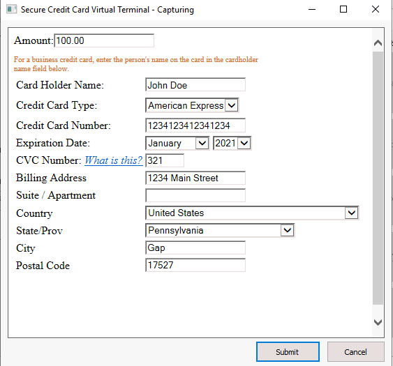 Entering the credit card Billing street Address. Note that this address will be defaulted by the billing address but can be changed to match the credit card's billing address.