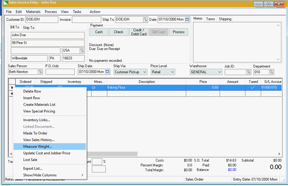 Complete the following steps to enter an inventory item that is sold by weight into the sales order:
