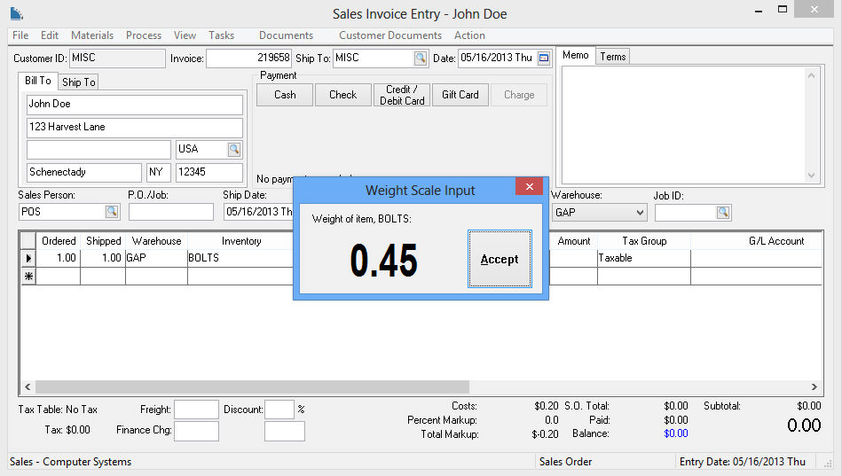 Click the OK button to copy the weight from the scale into the Ship column of the sales invoice or POS window.