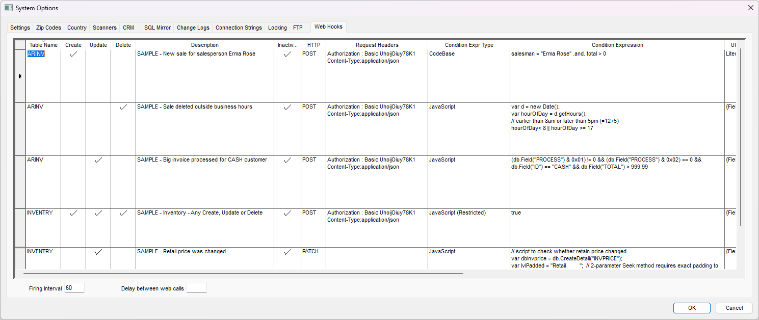 The webhooks process is launched whenever a record is saved within the Table Name. This table must be the header of the document. For example in the first example the ARINV table identifies the sales invoice document. Review EBMS Tables and Fields for information on identifying EBMS files and field names.