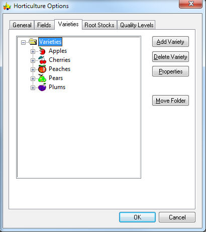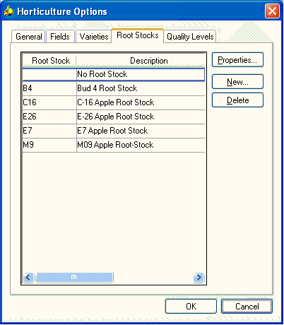 Go to Horticulture > Options and click on the Root Stocks tab to enter optional plant types or rootstocks.
