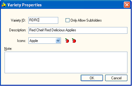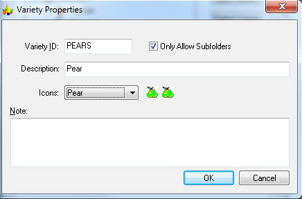 Enter the fruit group into the Variety ID entry field. Enable the Only Allow Subfolders to identify the entry as a fruit group rather than an actual variety. Enter a Description and select an appropriate Icon. Contact your customer service representative to add additional Icons to the list or manually add records to the ESVARICN.DBF file. Use the folder icon for fruits or vegetables that are not listed within the Icons list. Enter any applicable notes and click OK to add additional fruit groups. Repeat this step for each additional fruit group.