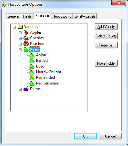 A list of all the fruit or produce grown should be listed within the Varieties tab of the options dialog. Go to Horticulture > Options and click on the Varieties tab as shown below: