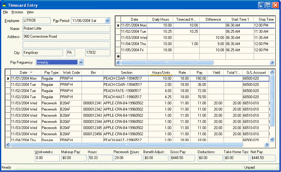 A timecard may contain an assortment of piecework pay and standard hourly pay. The example above has an assortment of pay entries that are posted to the horticulture module.