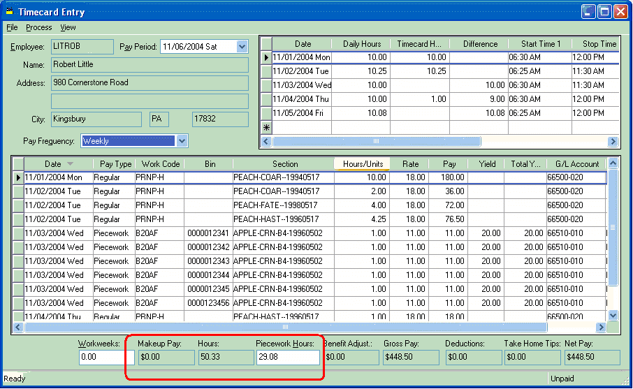 Makeup Pay and Piecework Hours are values at the footer of the timecard that should be evaluated when processing timecards that contain piecework pay.