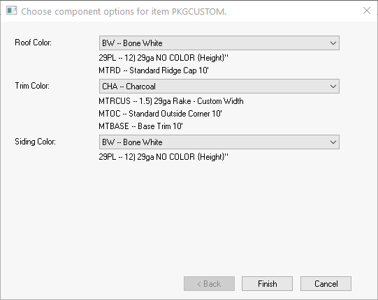 Metal packages allow the user to bundle multiple items within a materials list in a sales order or proposal. This option is useful to create a metal kit based on the building demensions. These materials list may have common color settings or styles. Pricing for the entire kit is listed within the order or quote.