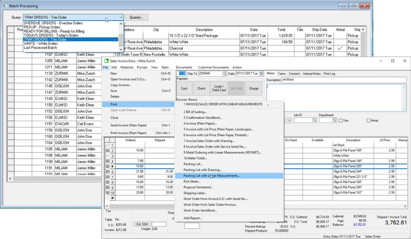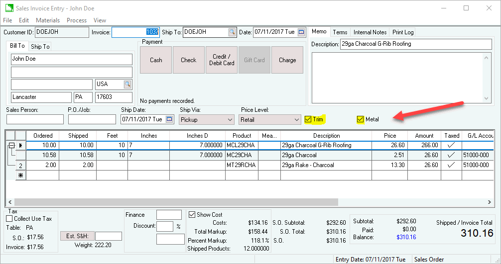 Integration between quoting, sales, design, manufacturing, and accounting within a metal supply center can save lots of time and increase accuracy. The sales tools allows the user to record individual orders with custom length metal panels, stock & custom trim, metal packages, and more.