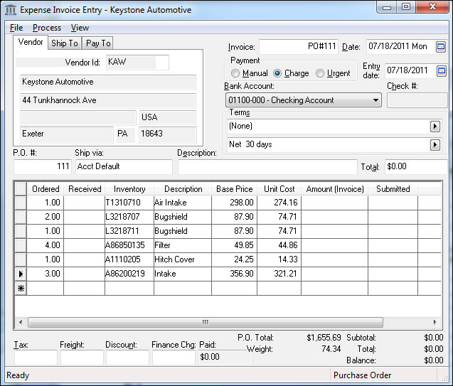 1. Verify that all the parts are listed that you wish to purchase. The quantity Ordered is the quantity that will be submitted to the vendor. The Received quantity should stay blank until the parts are received from the vendor. An option within the expense options dialog determines if the Received quantity is copied from the Ordered quantity or kept blank. Complete the following steps to change the option: