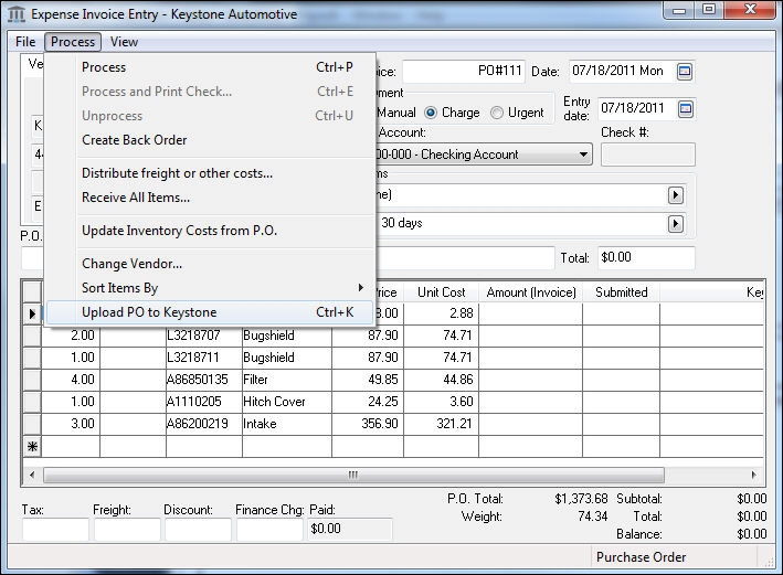 1. Select Process > Upload PO to Keystone from the purchase order menu as shown below: