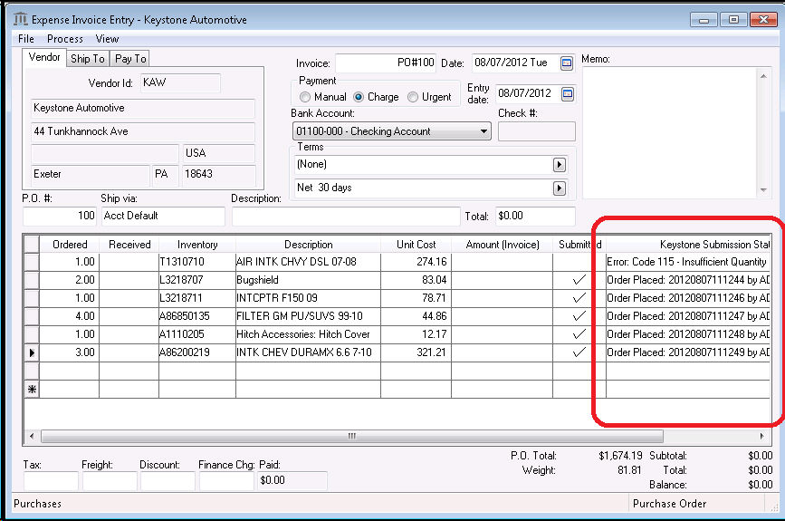 Continue with this section after a purchase order has been created within EBMS containing an order of parts. Complete the following steps to send a purchase order electronically to Keystone: