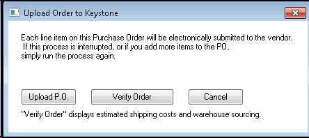 1. The following dialog will appear to verify that you wish to launch the purchase order upload to Keystone.