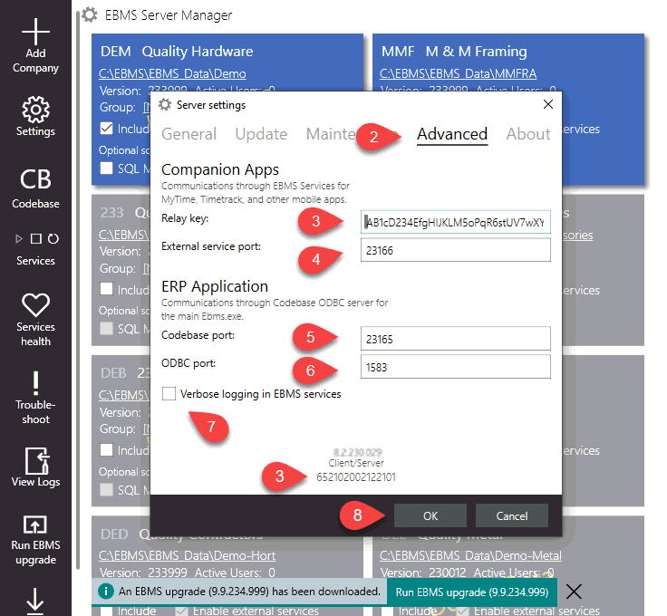 *Note: If you are running EBMS as a standalone instead of as a client/server the Codebase server port and ODBC port input boxes will not be visible as shown in the example below.