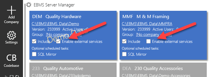 Enable the External Services option for each company data set that will be accessed by the MyEBMS App as shown below: