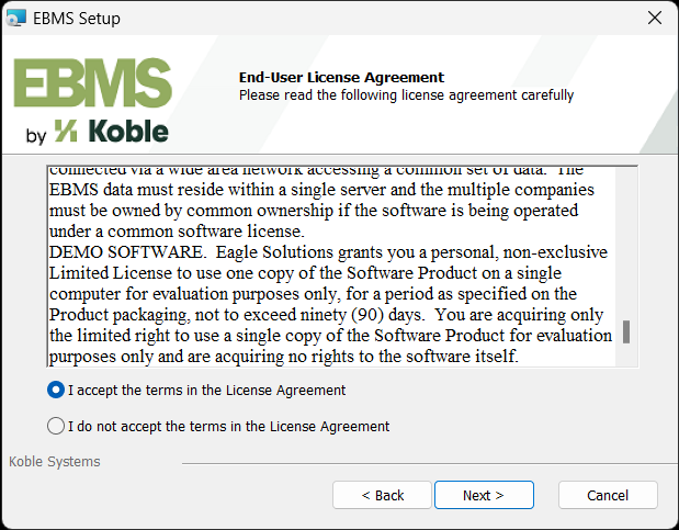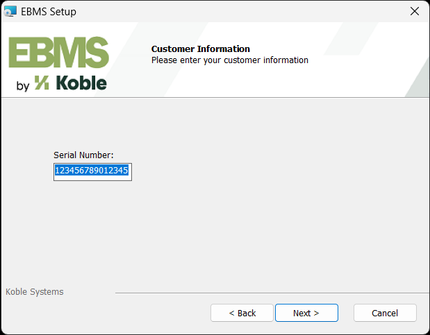 Enter the EBMS license Serial Number that was used when installing the server.