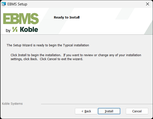 Click Install to install the EBMS client on the workstation. Repeat for each workstation on the network.