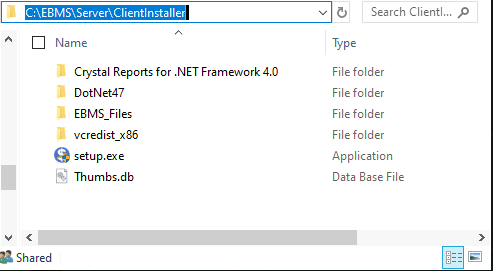 The client installation program is found on a shared folder within the server drive labeled ClientInstaller and should be accessible from each workstation contains the EBMS client. This path is part of the EBMS install process on the server located in EBMS folder setting in Server Manager > Settings > General (C:\EBMS)\Server\ClientInstaller. Review Initial Installation on the Server for instructions to install EBMS on the main server.