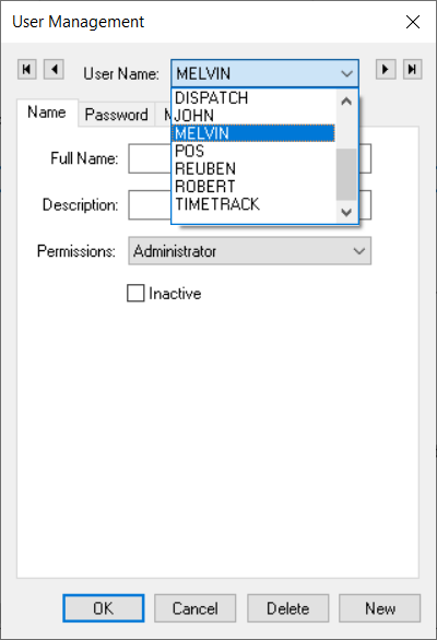 Enter the Full Name and Description information. The Permissions setting located on the Name tab will set the general security permissions that affect access to general company information dialogs launched from the File menu.