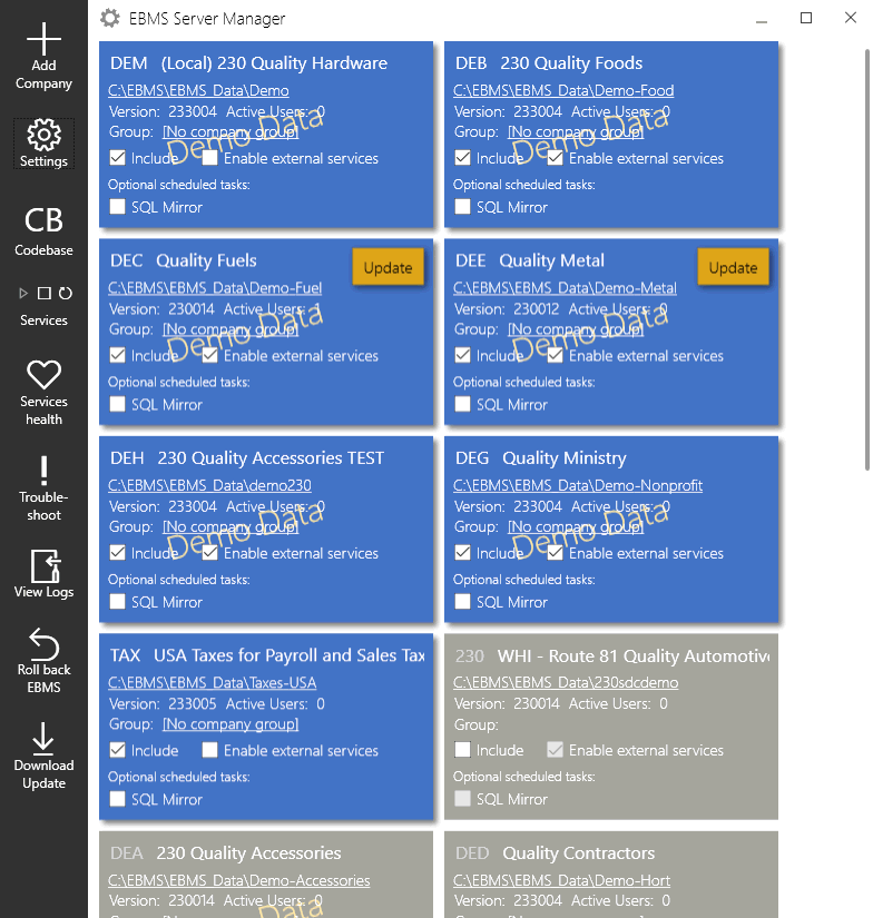 Multiple data sets (companies) can be grouped to restrict specific user data access. Review the Creating Company Groups in EBMS Server Manager for details.