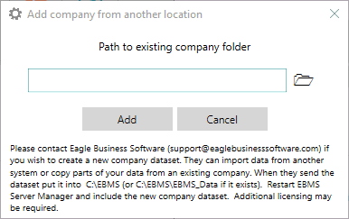 Click the Add Company option to add a data set outside the standard c:\EBMS\EBMS_Data path. Review the Enabling Access to Company Data in EBMS Server Manager section for information related to enabling or disabling access to an EBMS Company.