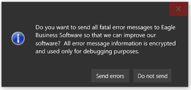 An information dialog will ask whether fatal error notification messages may be collected. It is highly recommended that a user selects 'Send errors.' This will enable EBMS technical staff to give better service to the user and will benefit