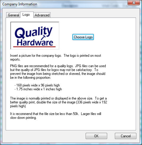 Click on the Choose Logo button to locate and select the proper graphics file. The familiar MS Windows open dialog will appear which allows you to select the proper graphics file on your drive. Use the following guidelines if you are creating your own company logo: