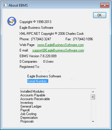 The complete list of modules installed for a given EBMS software can be listed within the About EBMS dialog within the software. Select Help > About EBMS from the main EBMS menu to open the following dialog: